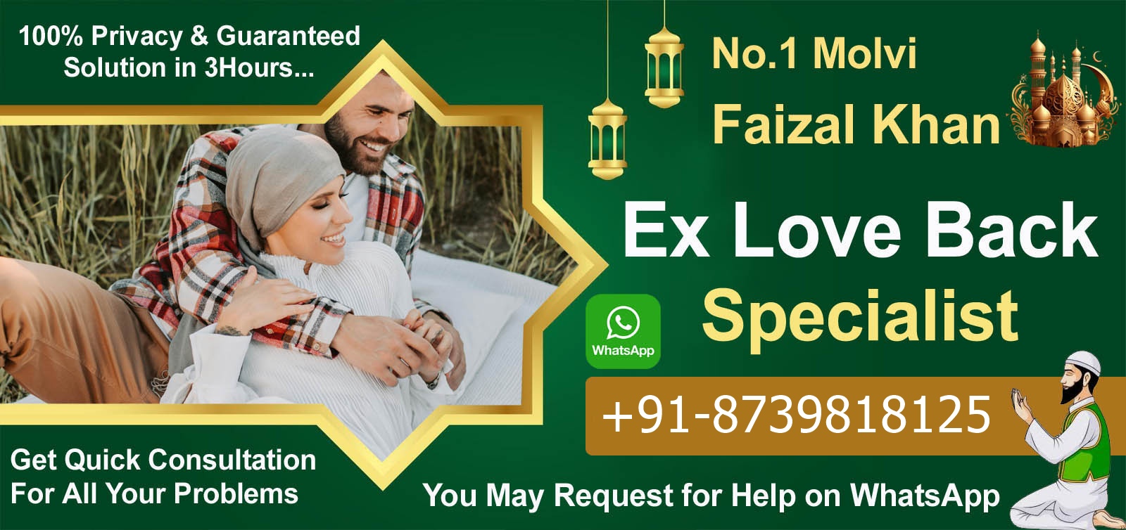 “My girlfriend had a terrible relationship. I quickly contacted to Famous Molvi Faizal Khan and told him everything about my life. He told me the mistakes I'm making and also what negative influences are impacting my love. My love with my girlfriend has taken a 180° turn and changed the fundamentals of my romantic life.”